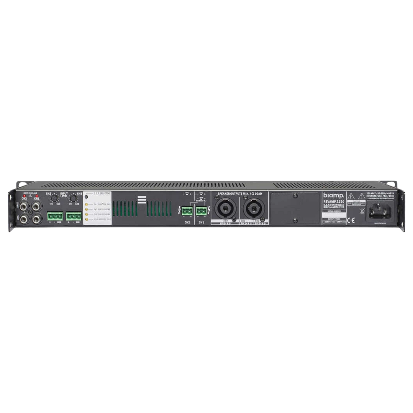 Digital-Verstärker 2×250 Watt,. Professioneller brückbarer 2-Kanal-Class-D- Leistungsverstärker mit Konvektionskühlung und intuitiven Statusanzeigen auf der Frontseite. ,REVAMP2250 ist ein professioneller brückbarer 2-Kanal-Class-D- Leistungsverstärker mit Konvektionskühlung und intuitiven Statusanzeigen auf der Frontseite. ,Für eine einfache Bedienung bietet der REVAMP2250 6 Presets, die einfach per Tastendruck auf der Rückseite ausgewählt werden können. Damit ist es möglich in wenigen Sekunden den Brückenbetrieb zu aktivieren, einen Hochpassfilter in einem Kanal einzuschalten und vieles mehr. Alle DSP-Einstellungen werden gesichert und beim Einschalten des Gerätes wieder geladen. ,Der REVAMP2250 Verstärker kombiniert auf clevere Weise eine einfache Bedienung sowie in Europa entwickelte Technik mit einer hohen Zuverlässigkeit und Ausgangsleistung.
