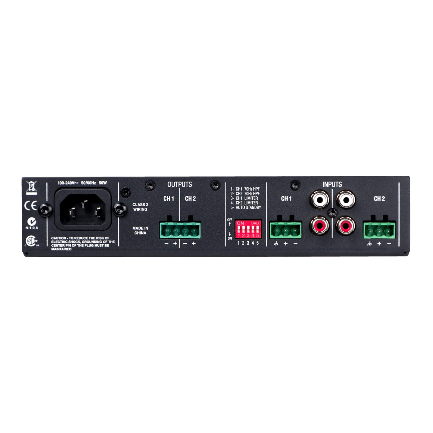 Verstärker mit 2 x 120W, Ausgangsleistung.Extrem kompakte Abmessungen mit 1/2 19´´ Breite 1HE. Optionaler 100V Trafosatz ,Der CSA2120 ist ein professioneller Leistungsverstärker für Audio-Installationen. Der zweikanalige Verstärker ist lüfterlos aufgebaut, bietet einfache Bedienung und kann mit einem 100V Trafomodul ergänzt werden.